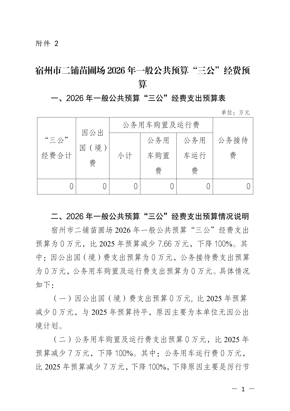 宿州市二铺苗圃场2026年一般公共预算“三公”经费预算